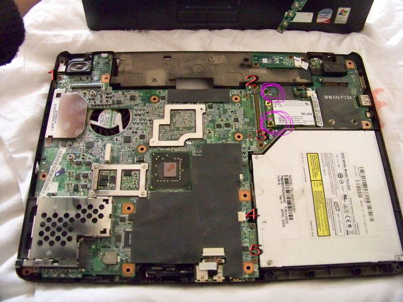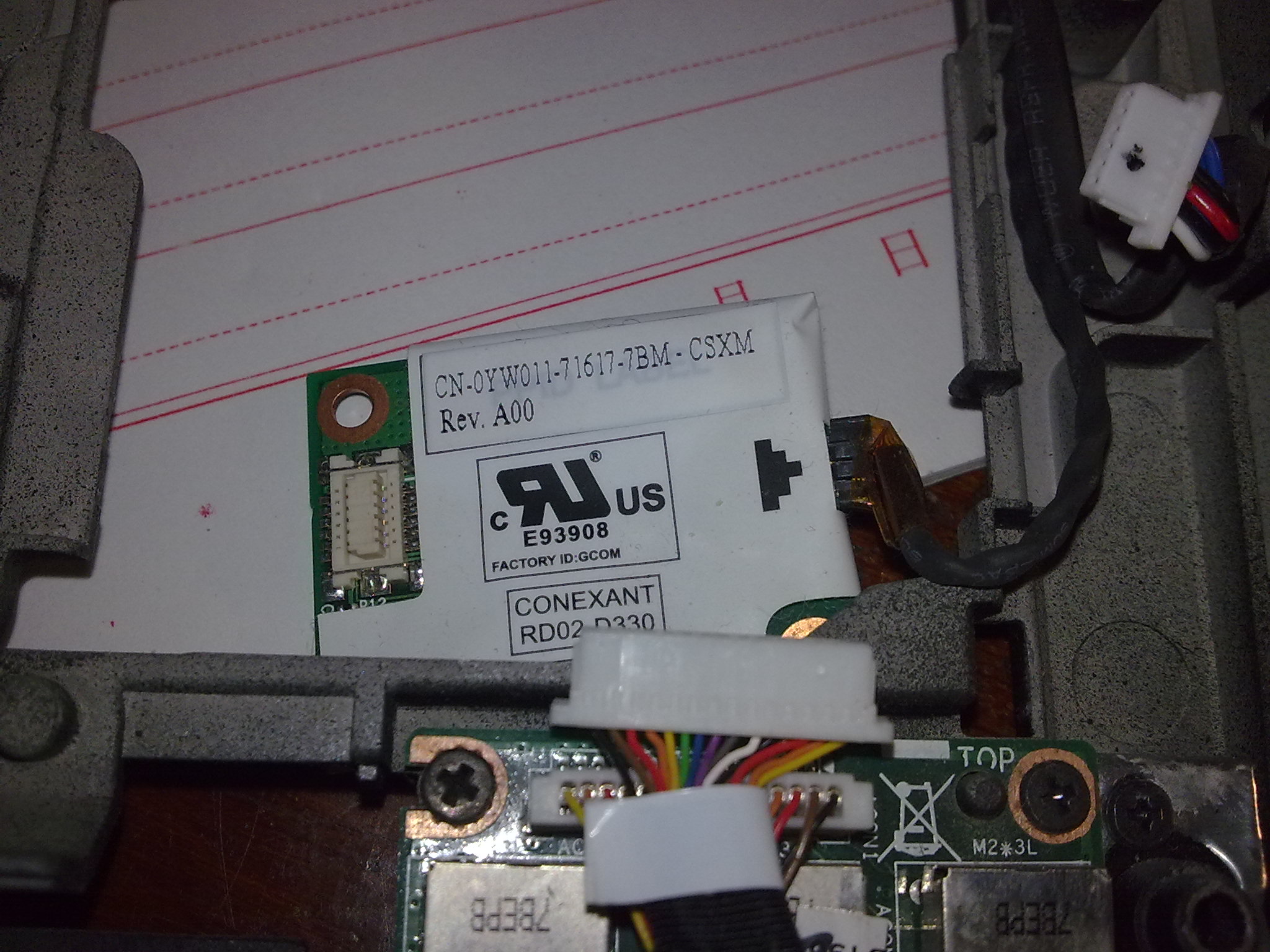 然后我们先把屏幕拆下,方法是:先拔掉左面和屏幕连接的拿长线,粗的那根,,,拆下键盘上面开机按钮的那块板的螺丝,然后拔掉显示屏连在无线适配器上面的连接线