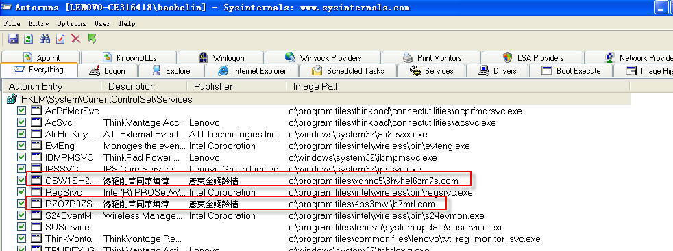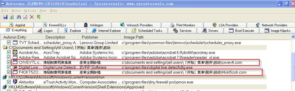 往下看这个具体例子。注意看autoruns扫到的病毒加载项(重点注意病毒文件的路径)