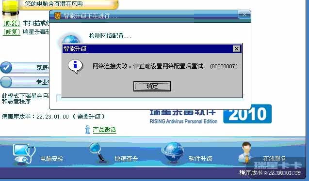 回复: 瑞星升级提示网络连接失败,请正确设置网络配置后重试。(80000007)