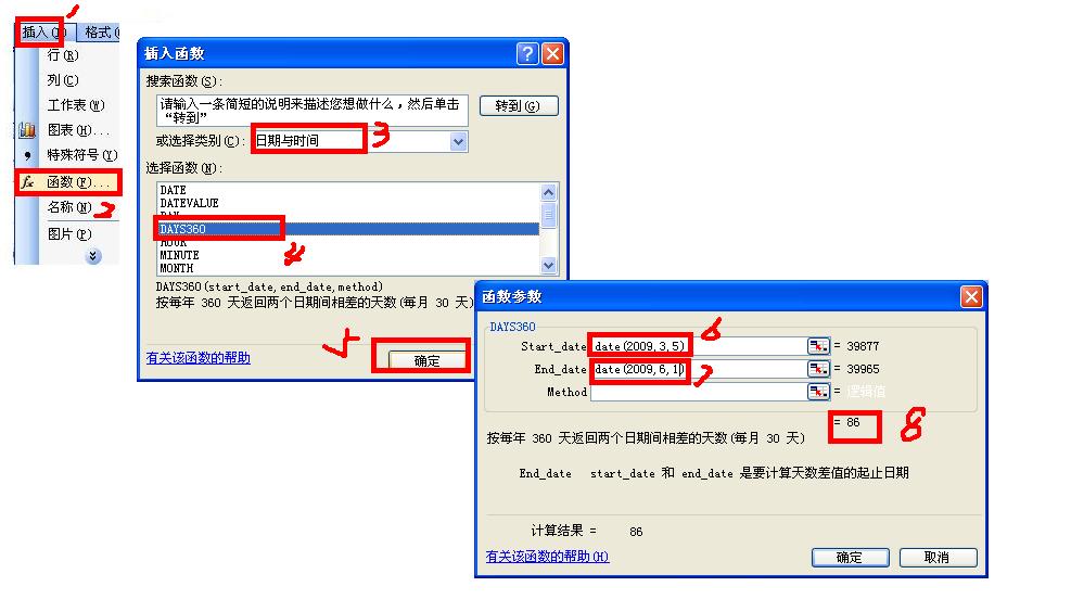 【注】上述函数是一年按360天计算,一月按30天计算的,计算结果并不精确,只能用于辅助计算,汗……。