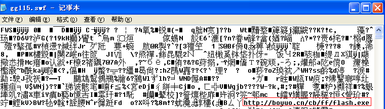 http://30mm.azzwg.cn/cb/ff/flash.asp?id='+Flashver+',该链接地址里flash.asp?id='+Flashver+'这部分实际上指出的是一个swf网马下载地址,其中Flashver代表的是flash版本,那么具体真正的flash网马下载地址是什么呢?要结合所挂首恶意网址源代码来分析。以下是首恶意网址源代码内容: