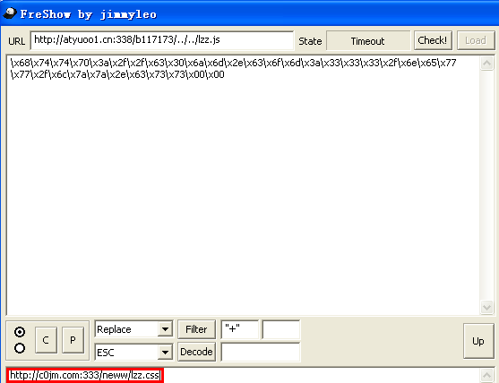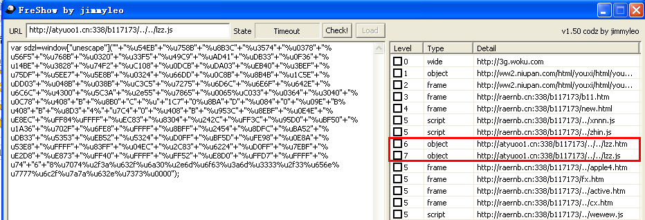 上图为我们使用freshow的check获取网站源代码后,通过filter过滤出的3个script,按照常规解密方法,我们会依次查看这三个script,但是我们发现这三个script并未见有异常。那么我们会认为这个网站是正常?通常我们在网马解密过程中,在获取网站源代码后,最好首先要做的就是仔细查看一下网站源代码,从顶部、中间、尾部等三方面来依次查看,因为我们知道工具不是万能的,它也有可能会忽略掉一些关键链接,而往往被忽略的链接,恰恰是我们最需要检查的链接地址。以上也是一些网马解密中的小经验吧,共享给大家。