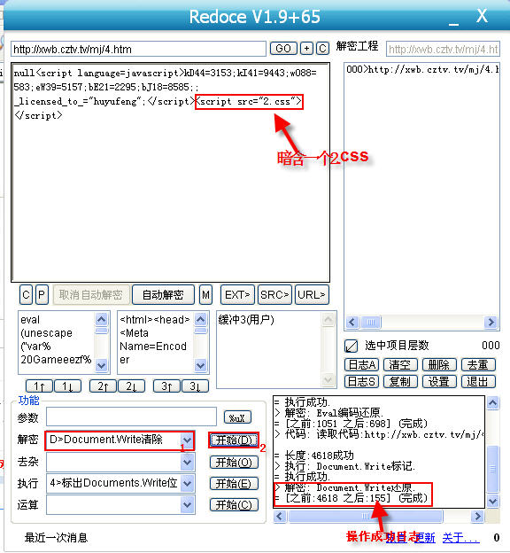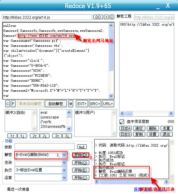 我在这里先抛砖引玉吧,先来讲解一下它的解密功能,ok,先来看一下6>Eval()清除(Beta!)和D>Document.Write清除这两个功能。在我们前期讲解的教程中,当遇到eval和document.write这个两个加密,我们发现freshow并不能直接来进行解密,eval解密需要借助在线解密工具,而document.write需要替换为alert,这实际给我们在解密过程中,增加解密时间。而redoce工具集成直接对此两种加密方式的解密,非常容易上手。先来看一下eval这个在网马解密中最常见的加密形式。
