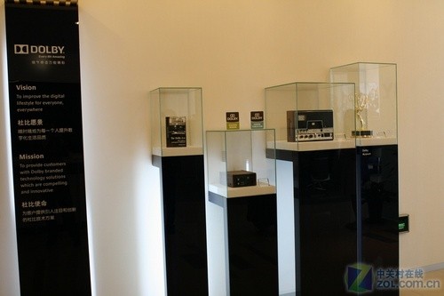 刚进入大厅,我们就看到了不少陈列的设备。这些设备都是在杜比音频技术发展过程中起到了非常重要作用的产品。在陈列展台的左侧,墙壁上铭刻着杜比愿景和杜比使命,这些铭文也体现了杜比的企业文化。