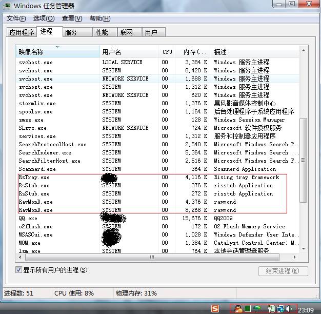 重新启动计算机后,打开任务管理器可以看到瑞星的6个进程(如图1);