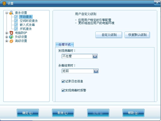 将手动杀毒设置成发现病毒不处理