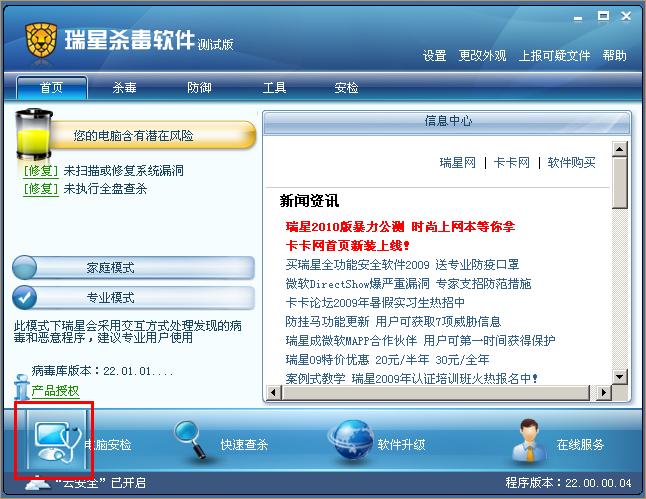 打开杀软主程序,下面的四个按钮中总是有一个显示为被点击状态