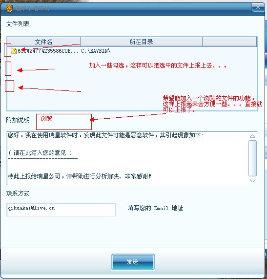 为了上报功能更加完善,我建议加入可以浏览上报文件,这样电脑中的可疑文件就可以方便上报,要限制文件的大小,不能大过多少M...