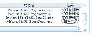 扫描,发现病毒,但是自动删除失败..bug出来了...看图: