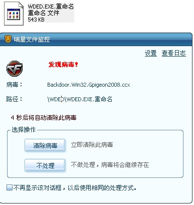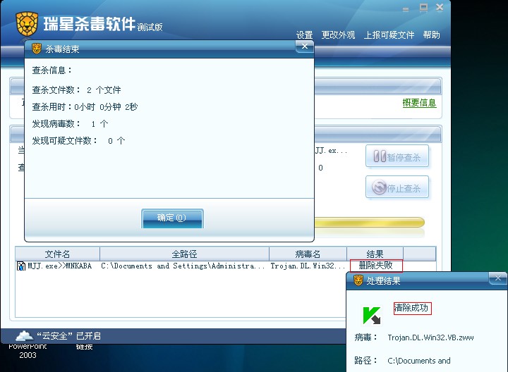在此病毒处理上存在无法删除的问题,同时病毒提示出现bug..不处理时仍提示清除成功!补充:至于这个软件是不是误报个人不研究了(样本上报)..但是这个病毒清理能力问题,以及逻辑问题是值得考虑的..