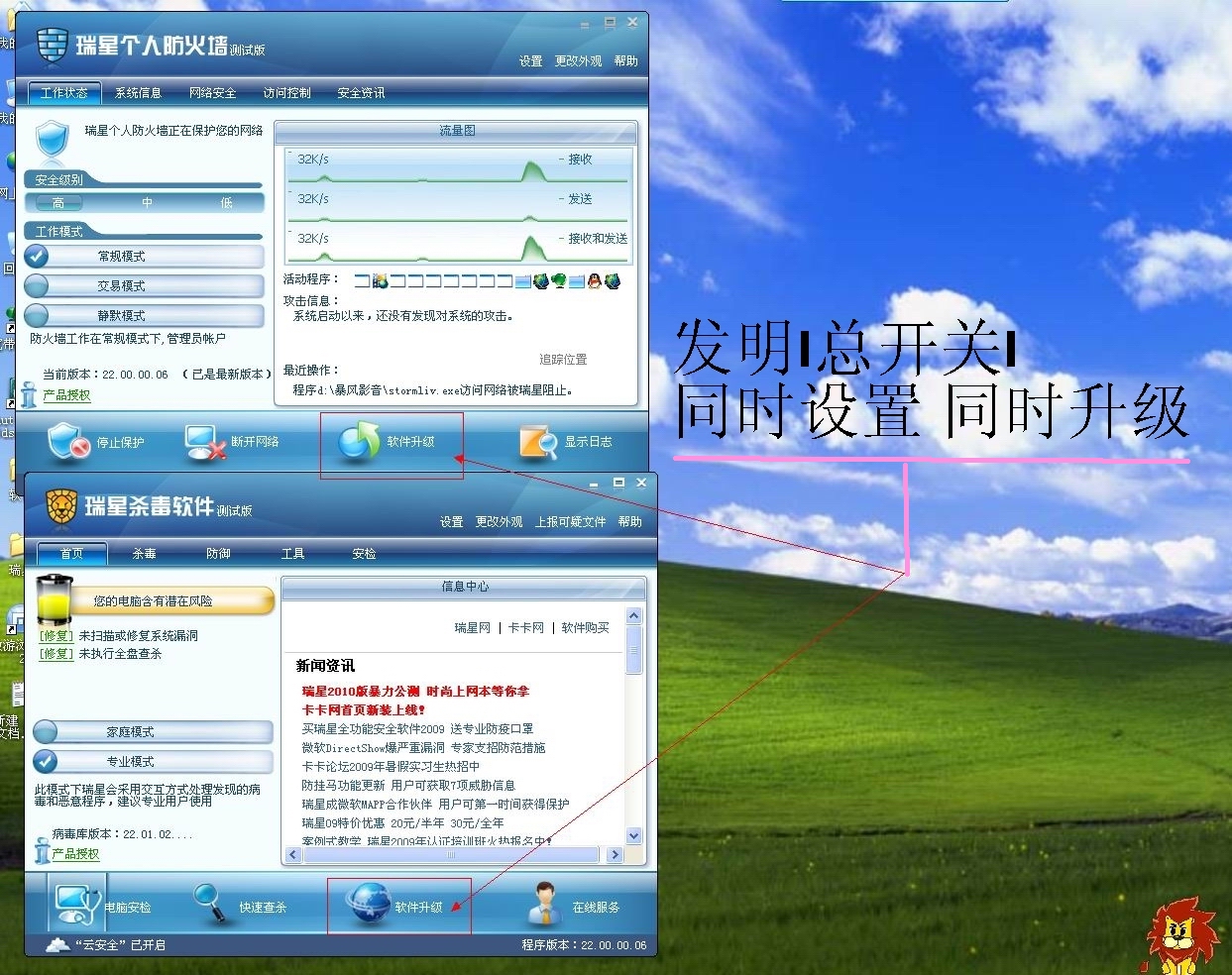 , 能够使安装 瑞星杀毒+瑞星防火墙+卡卡 的用户通过这个“总开关” 程序 同时升级和控制瑞星所有产品 省心省力多好啊。不用像现在这样 先升级瑞星杀毒 再升级瑞星防火墙 最后升级卡卡 光为了升级瑞星产品就得忙活几十分钟(包括眼巴巴看着屏幕等待升级成功的时间)