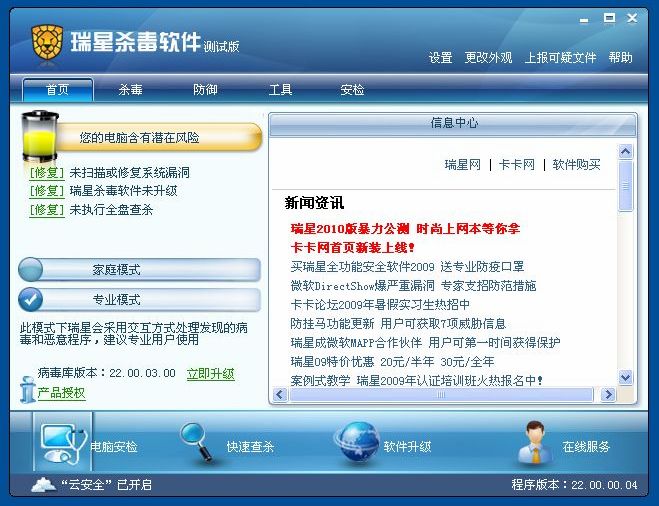 家中从98年就使用了正版瑞星,单位里网管装的是另一款国产杀毒软件,一直用着很不爽,今天碰巧看到瑞星官网有暴力公测2010马上删除了,安装了新版瑞星。测试如下:
