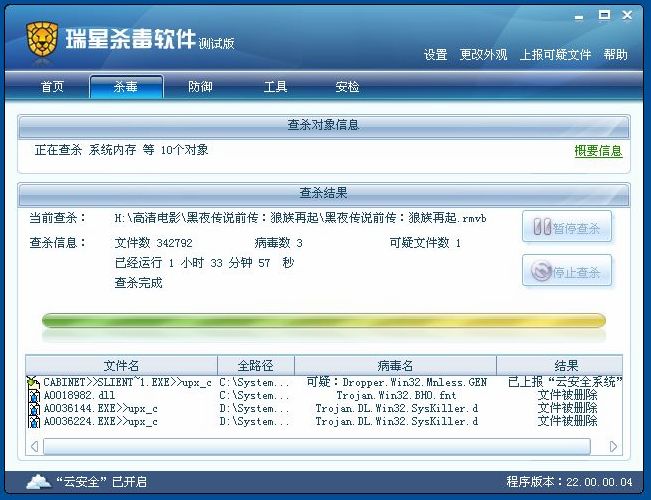 嗯,不错,全盘杀毒后发现3个病毒1个疑似病例...