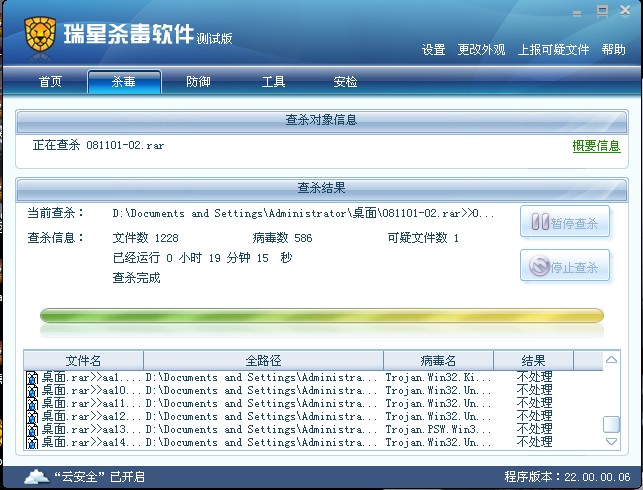 手工查杀病毒包46.7M的病毒包竟然用了19分钟,而且等待处理发现的病毒也用了将近20分钟的时间,但是40分钟的结果确实所有样本全部不处理...