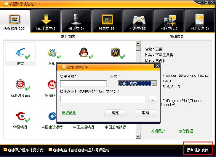 1.添加“自定义保护”功能,现在的瑞星保险柜,进行安全保护,是根据瑞星保险柜中支持什么样的软件和交易平台,就保护什么样的,如果用户在使用一款需要密码保护的软件或者在某个网站进行交易,需要密码保护,然而保险柜中却不支持用户要使用的软件或者是网络交易平台,那瑞星保险柜无法起到相应的作用,瑞星保险柜对用户来说已经毫无意义了。添加一个“自定义保护功能”以后,用户如果要使用哪个软件或者是网站进行交易,需要密码保护,用户就可以在瑞星保险柜中的“自定义保护”里添加适合用户使用的应用程序的路径,进行保护,如果要对某个网络交易平台进行保护,就要在网络平台的保护栏中加网址和网站名,对这个网站进行监控、保护,保护用户在这个网站中进行交易的时候,个人的资料不会泄露,让用户的信息安全得到保障。