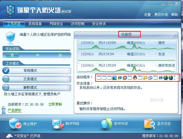 防火墙右侧区域用“流量图”来概括是否合理?因为该部分除了显示流量图,还显示了“活动程序”“攻击信息”等。不妨改作“网络状态”或者其他更有概括性的用语。一个软件的细节往往能看出该公司工作人员的工作状态。