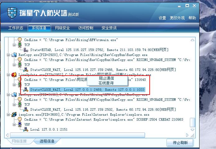 “系统信息”中,右击某个网络连接,建议增加“阻止通信”“在线查询”的功能。“阻止通信”,即指阻断该连接与网络的连接。“在线查询”,即指通过建立一个网络连接资料库,供用户查阅,判断连接的安全性。