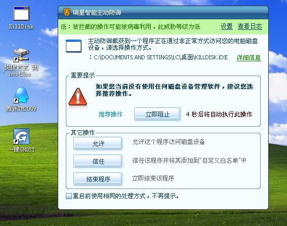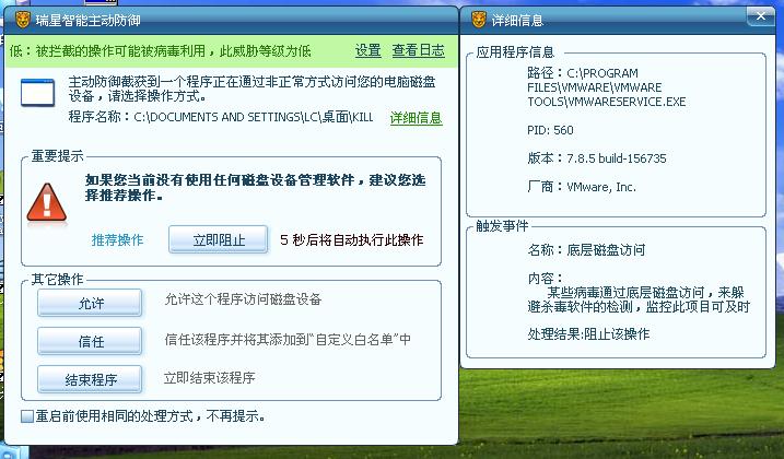 该病毒是对MBR即主引导记录区修改,使用户无法正常进入系统。MBR是在操作系统载入之前被读取的,因此MBR是成功进入系统非常关键的部分。而瑞星的主动防御提示显示的威胁级别为低,令人难以捉摸啊。而且,默认情况下是不对其监控的,这样安全隐患很大啊。如果病毒只是想破坏系统,那么默认设置下的瑞星毫无还手之力。望工程师重新考虑,是否在默认设置下对其进行监控。