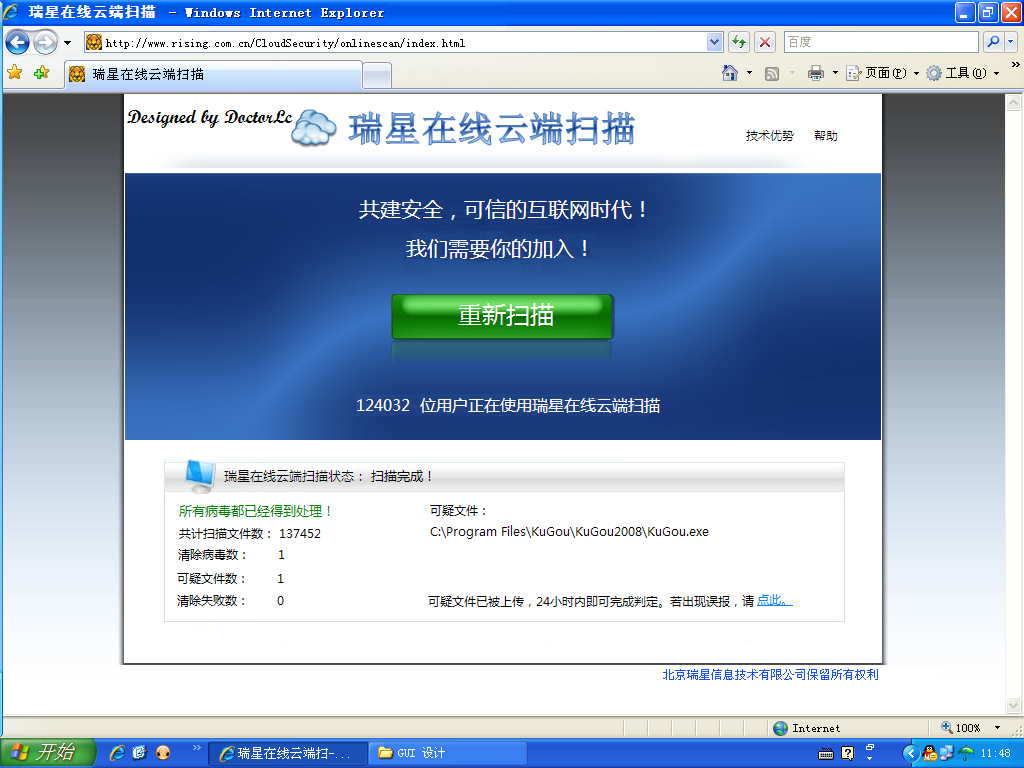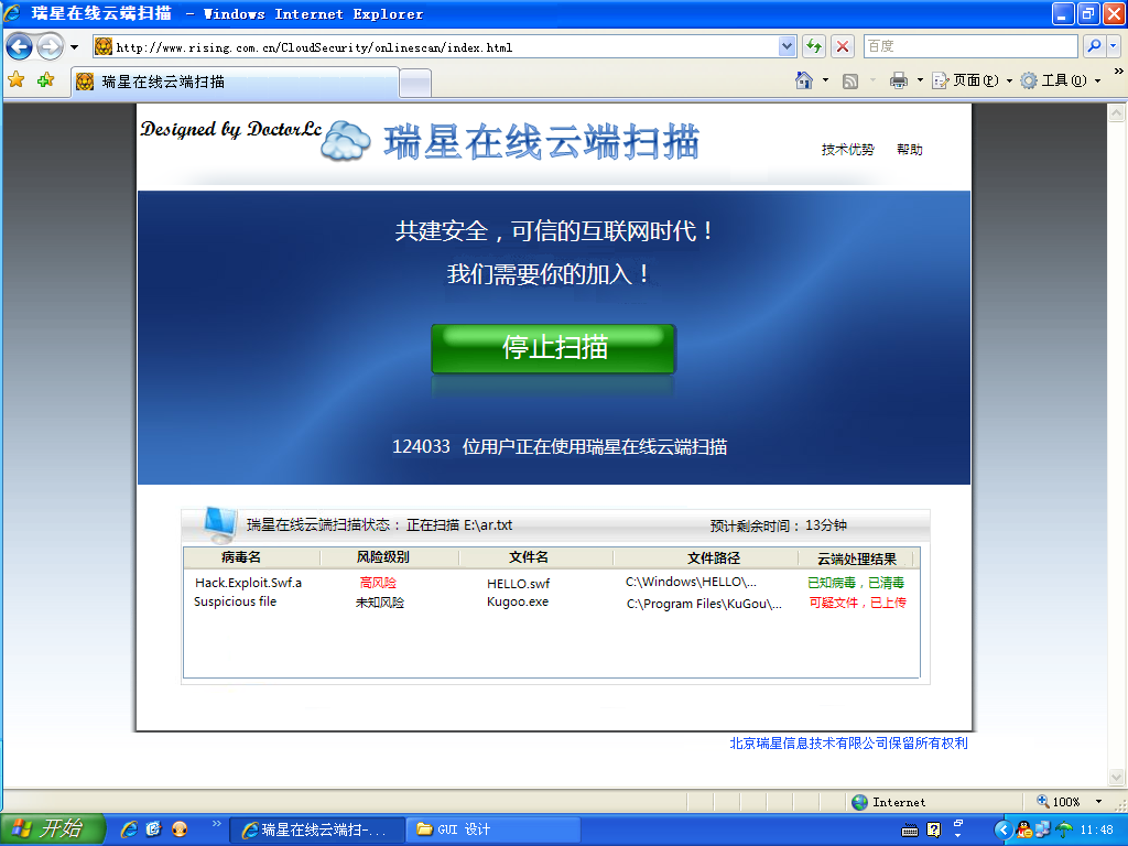 在线扫描有其独特的优点,而瑞星的在线云端扫描必须具备其他在线扫描所没有的优点。首先,应当提供清毒功能。许多打着“在线杀毒”旗号的在线扫描,只能查毒,欺骗用户感情!如果瑞星提供免费的清毒功能,应该会招揽许多用户。其次,采用更加灵敏的启发式扫描引擎。通过启发式扫描引擎,可以上报更多的可疑病毒文件,增强云安全的样本收集能力。这个应当是在线云端扫描吸引用户的最大亮点。许多安装其他杀毒软件的用户,可能会抱着试一试的心态使用在线云端扫描。而如果启发式扫描引擎能报出未知病毒,那么一定会使这些用户眼前一亮,对瑞星刮目相看。安装瑞星的用户则可以将在线云端扫描当成可疑病毒扫描工具,来进一步查杀计算机病毒。在线云端扫描还可以当成新引擎或新病毒库的试验室。新的病毒库先送到在线云端扫描,如果没有人反馈误报情况,则可以提供给所有的瑞星用户升级。另外希望提供注册服务。每个使用在线云端扫描的用户都必须注册一个帐号。用户在帐号上可以查看自己的扫描记录,已提交的可疑文件分析的进度,如果发生误报,可从账号中申请恢复被误报的文件。最后需要提的是UI设计。目前的在线查毒界面实在是糟糕的无法形容。希望设计出更加人性化的界面,优秀的UI会吸引更多的用户。以下是个人的设计图纸。希望瑞星考虑此项提议。