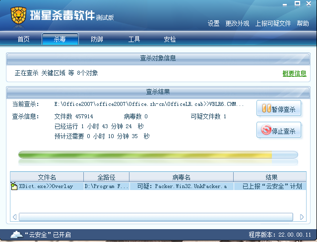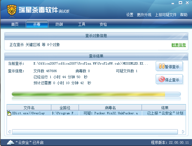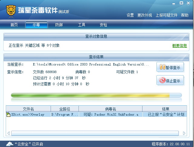 10版在计算杀毒所需时间有很大的偏差,这个问题从07版就存在,一直没有解决,特别是最后部分,通常提示10分钟,可以是1个小时甚至更多。