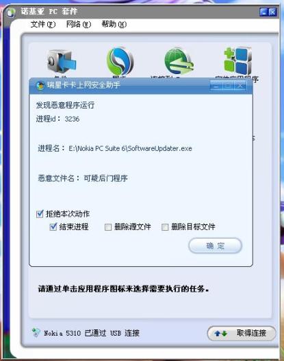 看见这个图了没有,我用的是诺基亚PC套件,我上报了,结果是安全的文件!我有点奇怪了,怎么是卡卡提示,这是辅助类型的软件,我要是当初没有选择安装,是不是就没有提示了!假如有类似的恶意软件,作为老大RAV一点小小的提示都没有,日志里面也没有记录!希望吧主要,和次要份清楚!杀软才是头头,至少来说给点提示!恶意软件!还有就是漏洞的问题,这个大家可能都提过了,以前是RFW上面的,自从放到卡卡上面,卡卡成了必须要安装的辅助软件,对于我而言,卡卡并不是太好用,而又夹在RFW之间,很尴尬的局面!