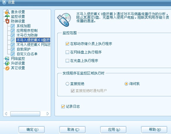 木马入侵拦截(U盘拦截)通过对木马病毒传播行为的分析,阻止其通过U盘、光盘等入侵用户电脑,阻断其利用存储介质传播的通道。