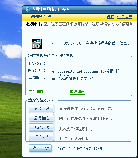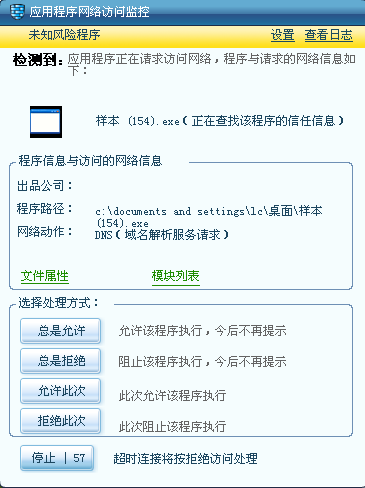 运行后,防火墙弹出提示,该病毒尝试连接网络。