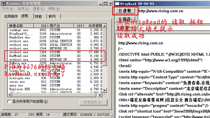 PID为1376的防火墙RavMonD.exe消失了,点击HttpRead的 读取 按钮,瑞星防火墙无提示,读取成功