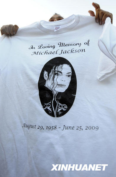 6月25日,在美国洛杉矶加州大学医疗中心外,歌迷展示迈克尔·杰克逊的纪念T恤衫。新华社记者戚恒摄
