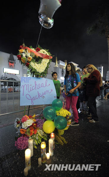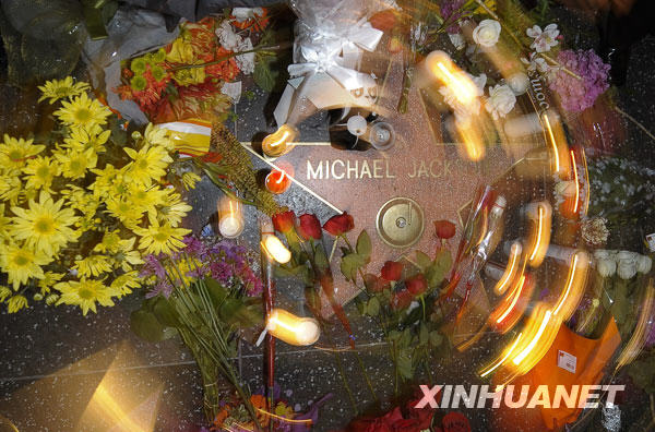歌迷聚集在美国加利福尼亚州好莱坞星光大道的“迈克尔·杰克逊星”旁献花悼念