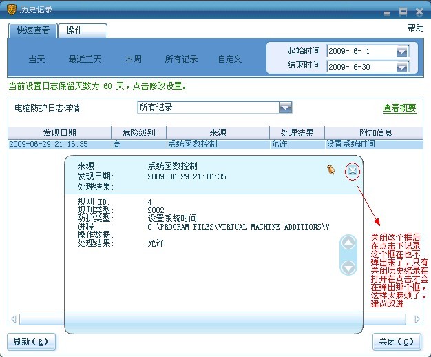 今天升级瑞星后,发现瑞星在历史纪录里改进了,点击下记录就会弹出一个框显示记录的详细内容(见图)