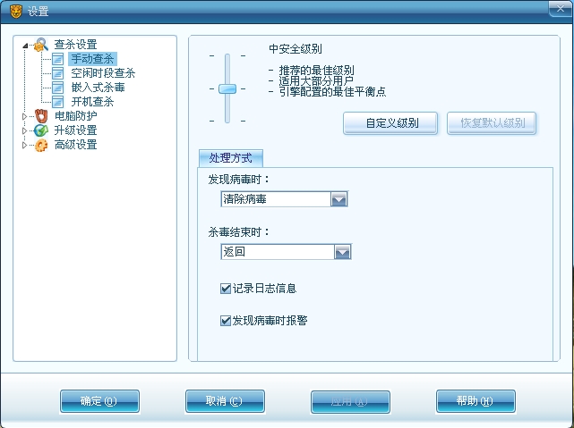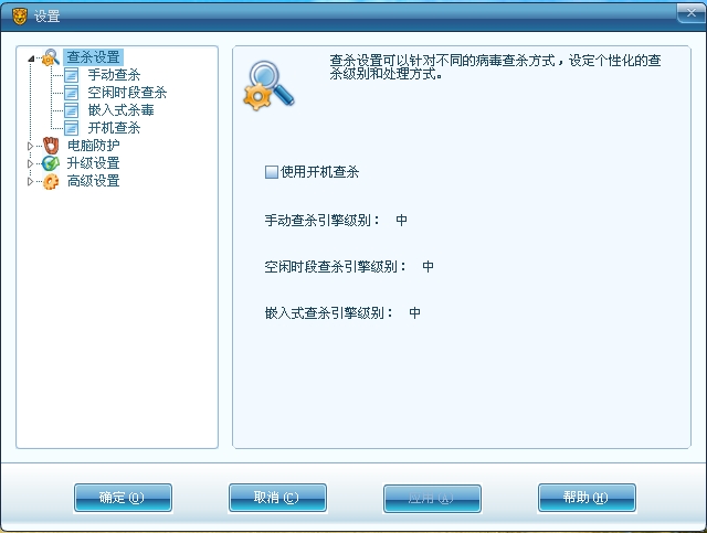 这张图是手动查杀的设置图,用户可以在这里设置手动查杀时候所启用的引擎级别,发现病毒时候所采取的方式以及杀毒结束时所采取的动作等其他一些设置。