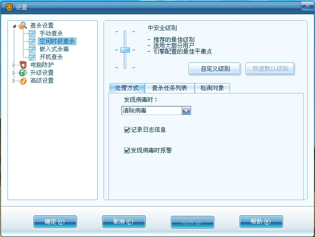 这张是空闲时段查杀的设置图,处理方式我不用多提!值得一提的是,空闲时段查杀可以根据用户的需要,让用户自行设置空闲时段查杀(在图查杀任务列表里面)且灵活性非常大!合适上班族用户使用!而且还可以设置查杀对象!非常实用!