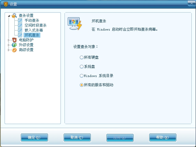 开机查杀,这个设置对于在查杀设置那启用了开机查杀的用户有效,否则您设置了也没有用,这个不用多说:建议瑞工把启用开机查杀的设置开关放到这来好一点!