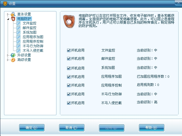 这张是电脑防护的设置图,在这里,我们可以很方便的设置在电脑启动时候,哪些防御启用,而且显示了当前级别等等,让用户一目了然!