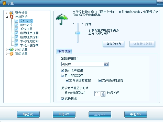 这张是文件监控的设置图,文件监控是瑞星杀毒软件的核心之一!有着非常重要的作用!用户可以再这里对其进行一些监控设置,以便更好的保护自己的电脑安全。