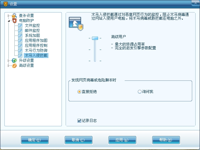 现在木马有很大一部分都是通过网页来进行传播,瑞星首创木马入侵拦截技术,可以很好的防御和拦截网页木马,默认设置在高级,可见瑞星对于网页木马的预防力度!力求让用户在浏览网页时候不被木马和病毒侵袭!