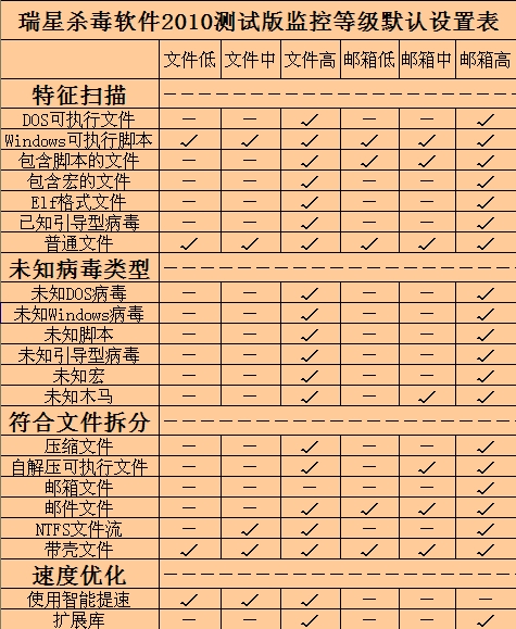 下面这张式手动查杀、空闲时段查杀以及镶嵌式杀毒引擎各等级时候的默认设置表,花了我很大的心血啊:
