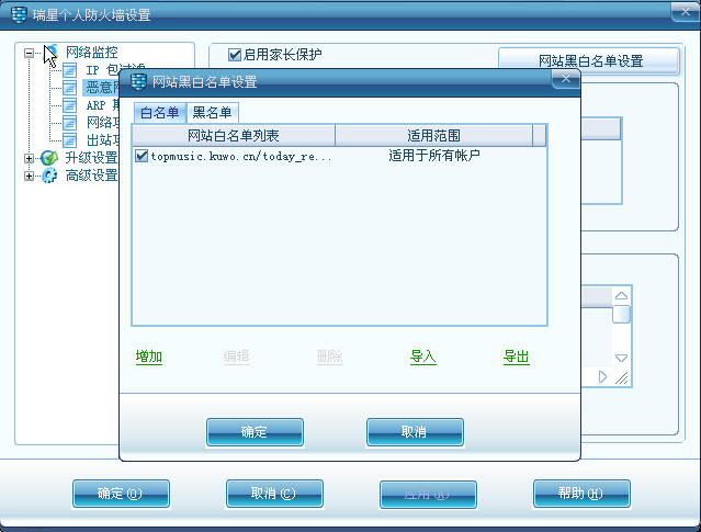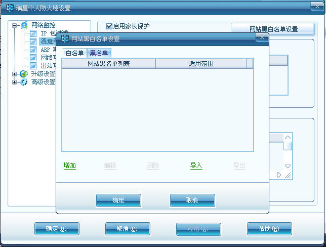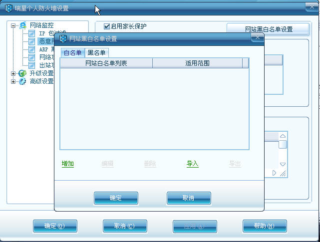 我打开防火墙主界面→『设置』→『网络监控』→『恶意网址拦截』→『网站黑白名单设置』,发现网站黑白名单中没有任何网址进行拦截与放行。如图2、图3