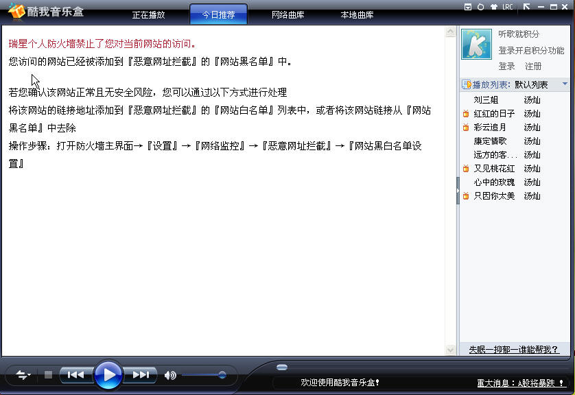 酷我音乐盒中的“今日推进”内容是完全嵌入播放器中而不是网页,也没有不健康或者是恶意内容,瑞星防火墙没有理由拦截播放器中的内容啊,请工程师尽快解决此问题
