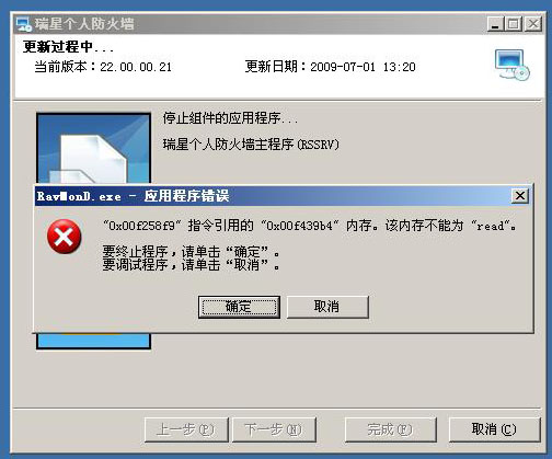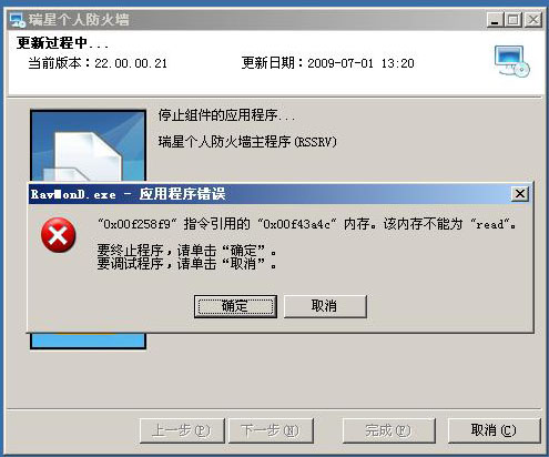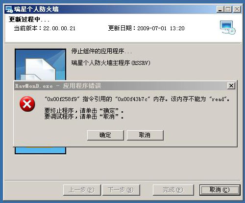 瑞星防火墙升级时,报错,导致无法升级,取消后再次升级恢复正常。(报错时弹出好多对话框,只留下三个)