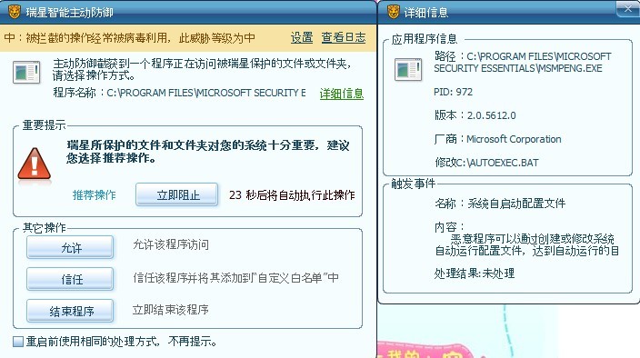 结论,是不是瑞星把系统的进程,该加到内存里常用的程序当危险动作,误为木马行为阻止了,以至于系统部分程序缺失,引起系统调用问题。