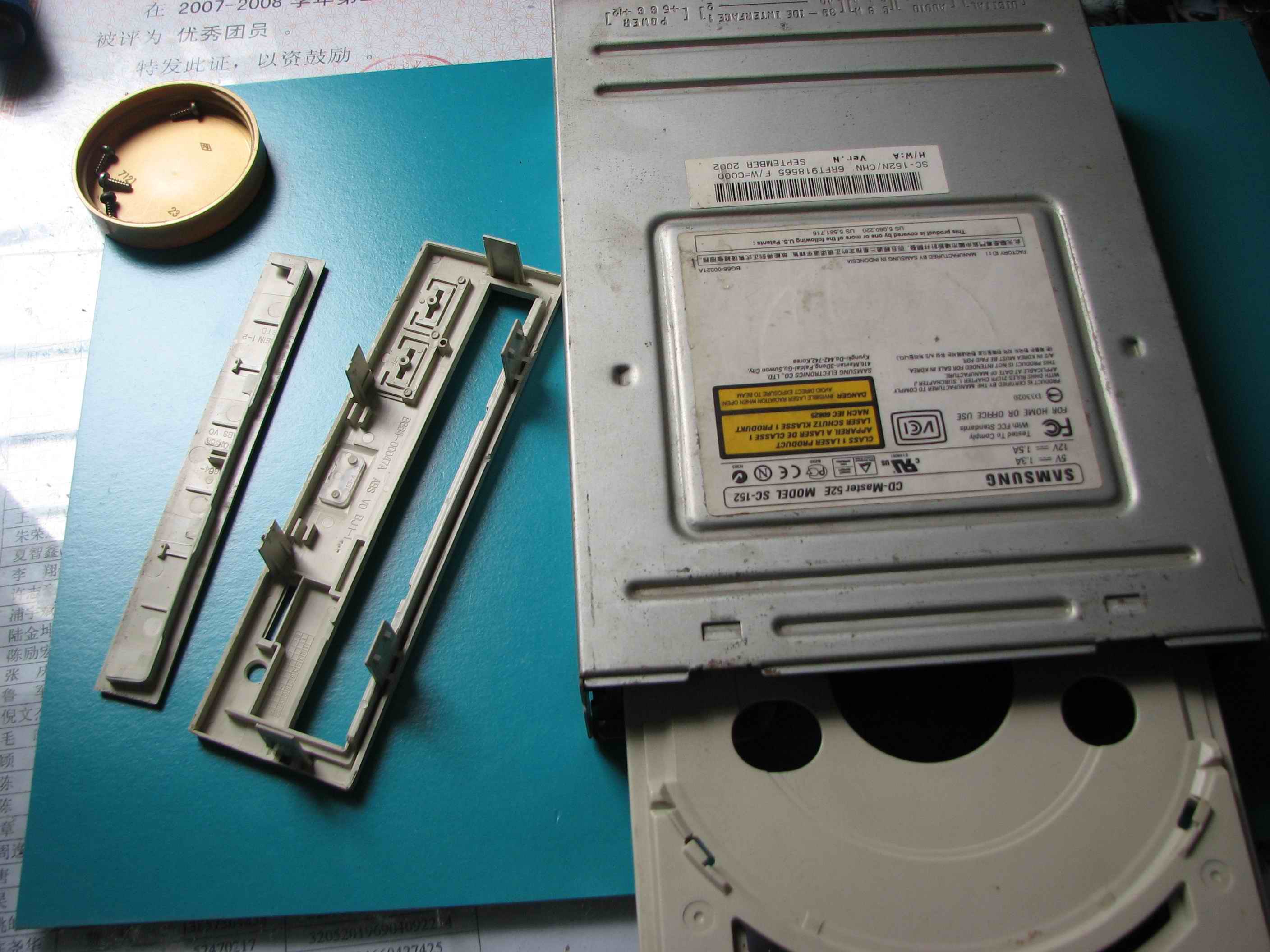 将光驱仓门打开,应该先开仓门再开始拆光驱,若当时忘了通电开仓门,别急,将回形针弄直,光驱前盖上有个小孔,将回形针插入此孔,仓门自然会被回形针顶开。