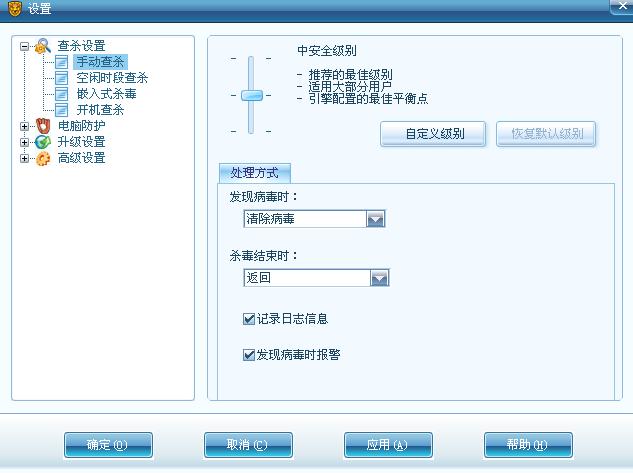 1、把瑞星杀毒软件里面的手动查杀选项按照上图所示设置,即:发现病毒设置为“清除病毒”和杀毒结束时为“返回”;