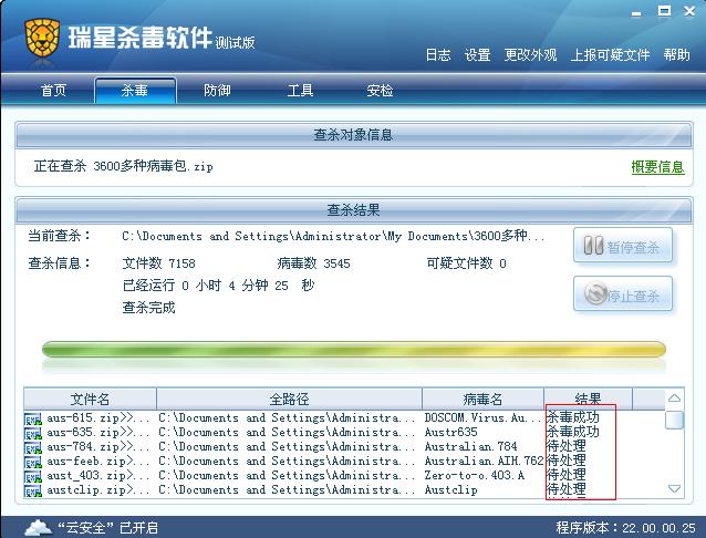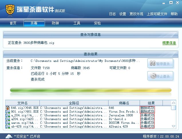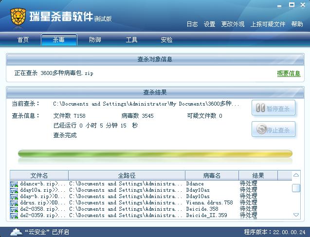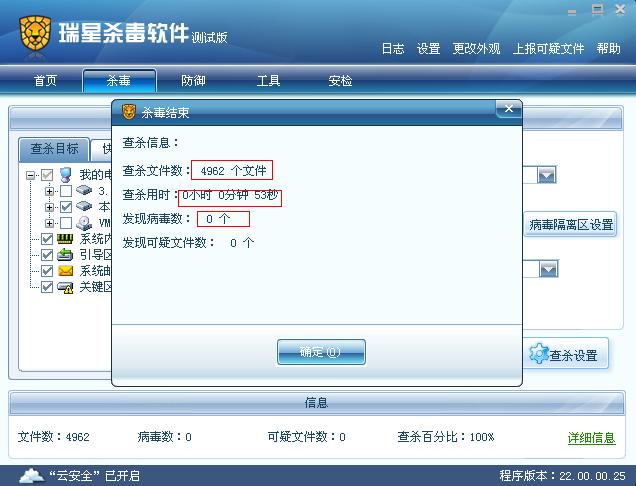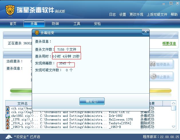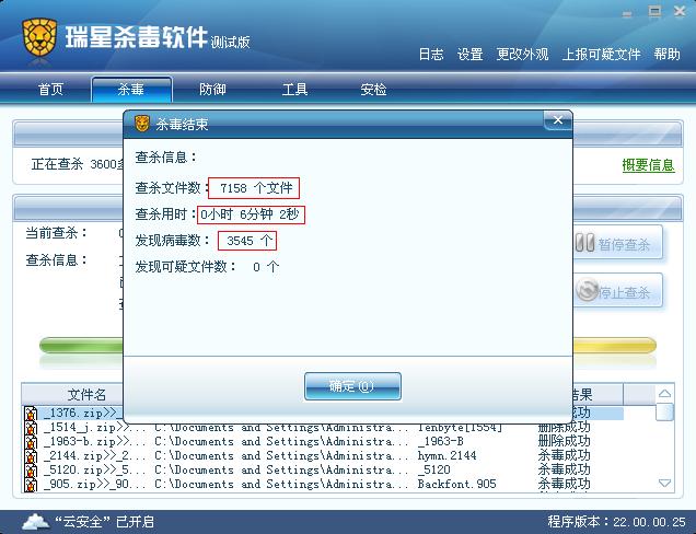 瑞星软件版本:病毒库版本:22.02.03.05 程序版本:22.00.00.25