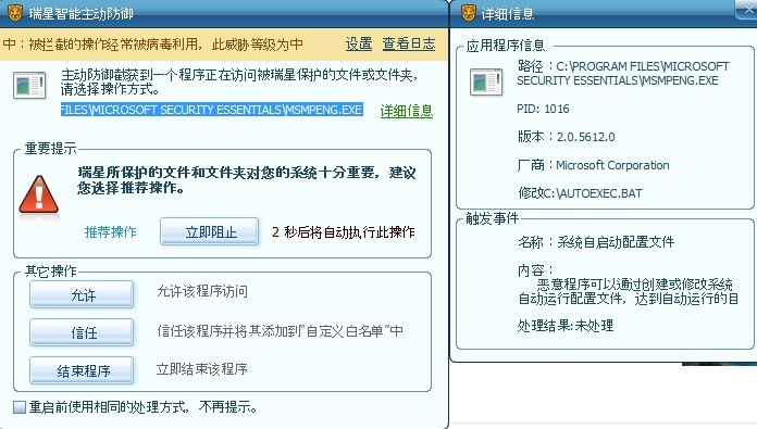 这个我不知道到底是不是正常的系统程序,就只有等瑞星处理哦,这样一来,总感觉很多本来该在常驻内存,提高启动速度的系统或软件程序,就不在内存中常驻,当使用时就要临时启动这些,我的电脑反应感觉就很慢了!