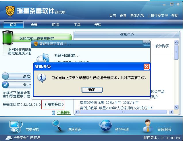 如果瑞星主界面显示需要升级,这时候我进行手动更新,在更新到一半的时候我将其停止升级。那么当我再次点击升级时,软件就会提示已经不需要升级了。