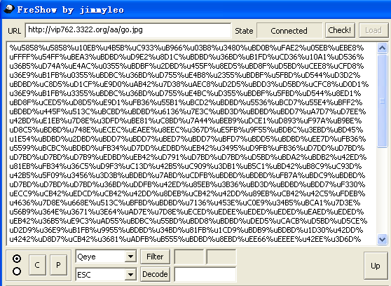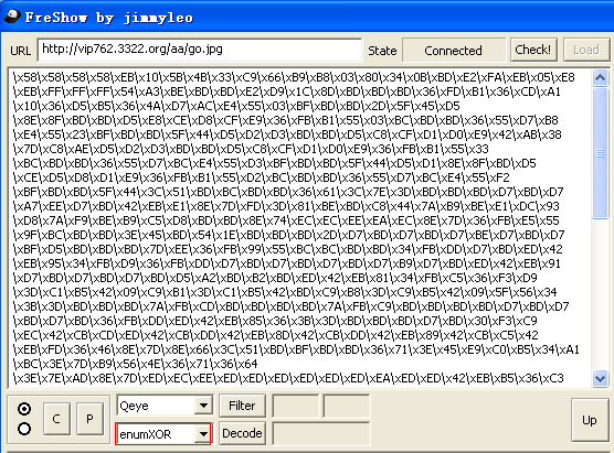 好,接下来我们来讲解一下如何解密此类网马,本例就以大唐电信网站为例:http://www.datang.com,在这里不具体详细分析了,主要来讲解一下利用directshow0days漏洞网马如何来解密。使用freshow分析出有如下恶意链接网址:http://vip762.3322.org/aa/go.jpg,该恶意网址的原文件内容如下: