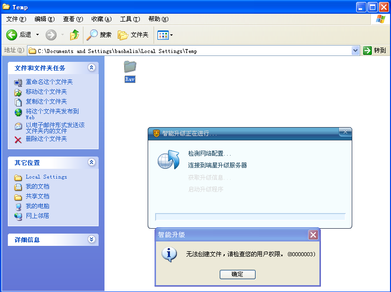 在当前用户临时文件夹内创建一个Rav文件夹,然后,用NTFS权限将其封死。瑞星便不能升级。