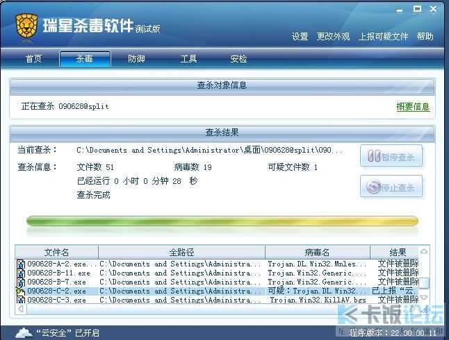 42样本 瑞星扫描后剩下26了 其中含1启发未清除。(本次测试不代表瑞星最终启发成绩,瑞星2010病毒库为测试版病毒库)剩下样本通过瑞星云安全上报系统上报测试速度。